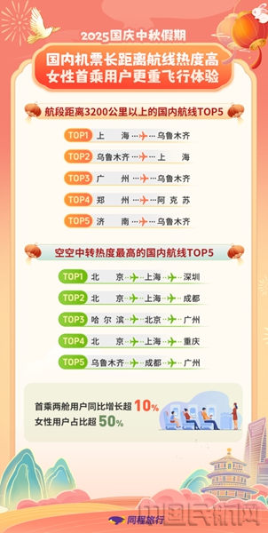 值得注意的是,同程旅行平臺上,假期乘飛機出行的用戶結構呈現出明顯的高品質和年輕化的趨勢。同程旅行數據顯示,國慶中秋假期,學生群體以近四成的比例,繼續穩居國內機票第一大客群,親子客群以近三成的占比緊隨其后。國內首乘用戶中,預訂國內機票頭等艙和商務艙的用戶同比增長超過10%,其中,女性用戶占比超50%。由此也反映出,首次乘坐飛機出行的用戶隨著消費水平的提升,也更加注重飛行的舒適度和體驗感。