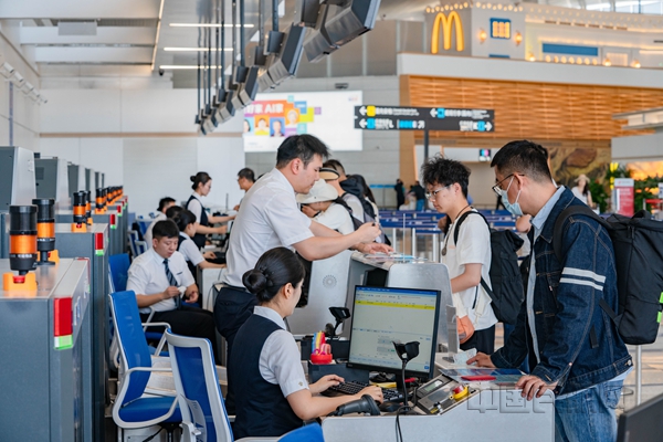 烏魯木齊天山國際機場地面服務人員為旅客辦理值機手續
