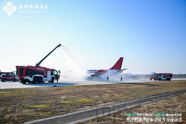 在飛行區2號小區,西安咸陽機場消防急救保障部模擬航空器偏出跑道、左側發動機起火冒煙開展實戰演練,消防、醫療人員緊急出動,以標準規范的操作、井然有序的流程展現消救融合硬實力。飛行區管理部現場演示跑道巡檢和道面搶修的標準化程序和動作指令,并依托機場道面維養創新實驗室平臺,形成一套道面“全生命周期管理”體系,充分展示了標準化作業的生動實踐。