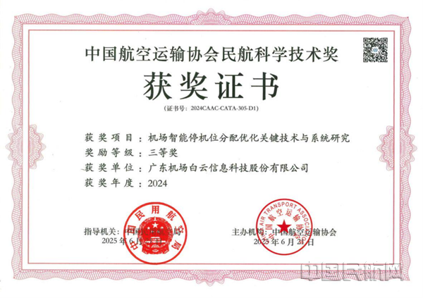 中國民航網 通訊員李慶泰、項嘉懿 報道:近日,廣東機場白云信息科技股份有限公司(以下簡稱“白云信科”)憑借“機場智能停機位分配優化關鍵技術與系統研究”項目,榮獲2024年度中國航空運輸協會民航科學技術獎三等獎。這一獎項不僅是對白云信科技術創新能力的認可,更標志著白云機場運行管理智能化水平邁上新臺階。