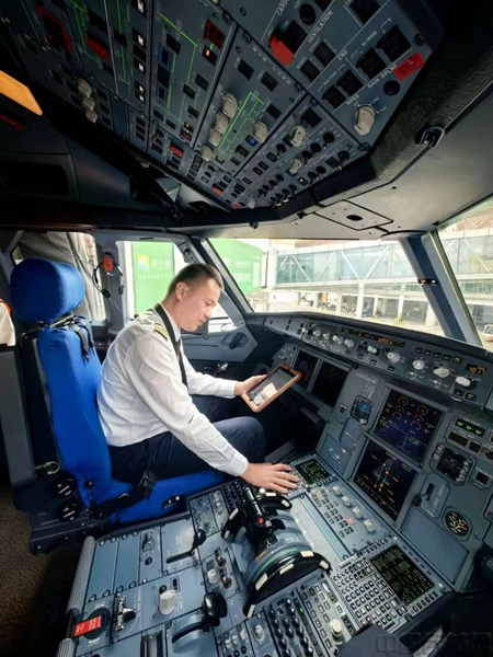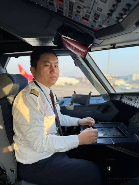 在飛機駕駛艙內的顧彥虎(東航供圖)