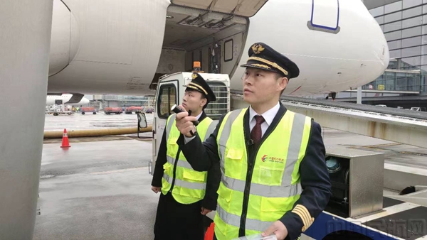 王爭龍(右)仔細地進行航前檢查(東航供圖)