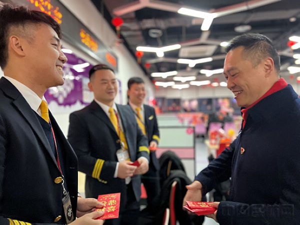 2月10日大年初一,王科4點多起床,先去了西部航空生產基地給執行龍年早班的機組送去了春節的問候和祝福,給大家發了紅包,互相問候了“新年好”。