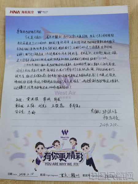 飛機起飛二十分鐘后進入平飛階段,乘務長安排乘務員前去了解旅客情況,得知老人經歷這一路坎坷還沒有吃早飯,當即準備早餐,但老人此時胃口不佳沒有食欲,乘務員便為老人剝了水果、倒了溫開水。整個飛行過程中,乘務組始終密切關注著兩名旅客的情況,旅客激動地把乘機全過程講給乘務長聽,感激之情溢于言表,并要來了信紙,親手寫下了感謝信,說一定要向王科董事長表示感謝,旅客在信中寫道:“在此特別感謝王董事長人性化管理。”“這股熱情的安排招待,體現了服務行業的宗旨‘為人民服務’,祝愿西部航空在2024年越來越好。”