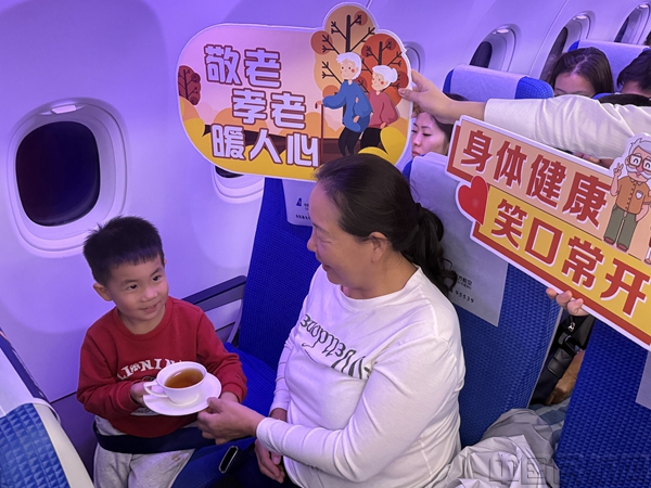 在活動環節,乘務組還熱情地向旅客推薦適合長輩出游的景點,涵蓋出發地及目的地特色景區,為云端旅途增添人文關懷。面對機上外籍旅客,乘務員生動講解重陽節登高望遠、敬老感恩的傳統習俗,使外籍友人對中國孝道文化產生了濃厚興趣,令客艙成為傳播中華文明的流動驛站。