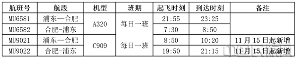 《中國民航報》、中國民航網 記者錢擘 報道:為進一步滿足旅客國際中轉及商務出行需求,東航將于2025年11月15日起加密“上海浦東—合肥”航班,由之前每日一班增加至每日兩班,新增航班的航班號為MU9021/MU9022,由國產民機C909執飛,去程08:50由上海浦東起飛,10:20到達合肥,回程19:50從合肥起飛,21:15到達上海浦東。