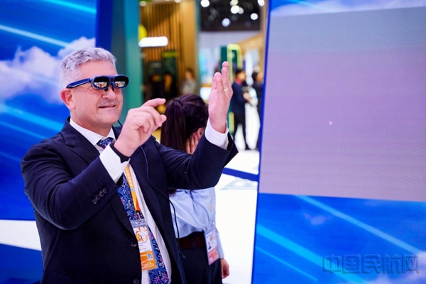 此外,“可觸摸的LEAP發動機”混合現實互動體驗裝置,也是展臺的另一大亮點。參觀者佩戴MR(混合現實)眼鏡后,一臺虛擬的發動機便躍然眼前,通過手勢操作,可以探索其內部結構,了解其核心工作原理——無論是“拆解”風扇葉片,還是“組裝”燃油噴嘴,都能在語音引導下完成。與此同時,旁觀者也可通過大屏幕實時看到互動畫面,共同感受航空科技的魅力。這一互動體驗不僅展示了LEAP發動機的部分技術細節,更是模擬了現實中GE航空航天發動機的維修工作場景。