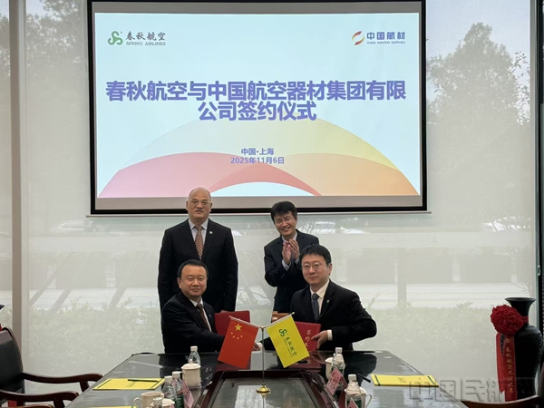 《中國民航報》、中國民航網 記者胡夕姮 報道:11月6日,中國航空器材集團有限公司與春秋航空股份有限公司在上海成功舉行戰略合作協議簽約儀式。中國航材集團黨委書記、董事長任宇與春秋航空總裁王志杰出席儀式并見證簽約,中國航材集團總經理助理、中航材華順公司董事長伍德海與春秋航空總裁助理兼總工程師徐康代表雙方簽署協議。雙方相關單位和部門負責人共同參加了此次簽約儀式。