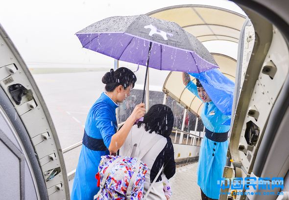5月29日,廈航MF8218航班在廈門機(jī)場(chǎng)落地后正準(zhǔn)備下客,突然暴雨傾盆。乘務(wù)員想方設(shè)法讓旅客少淋雨。她們拿出自己的雨傘,或是舉著干凈的大塑料袋遮在頭上,為旅客擋雨,把旅客送上擺渡車。圖片作者:賀晟(廈航)