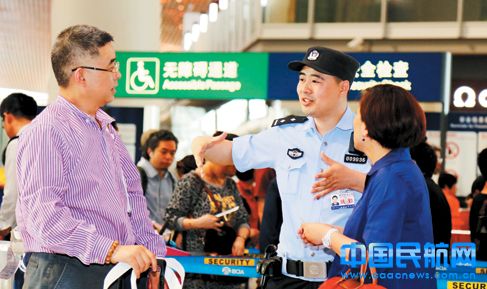 在機場經常有旅客因隨身攜帶行李過大而無法快速登機。近日,首都機場公安分局民警在安檢現場為旅客答疑解惑,避免旅客過檢后才被告知行李需要托運,延誤登機。圖為首都機場公安分局民警告知旅客行李大小要求。圖片作者:劉莉(首都機場公安分局)