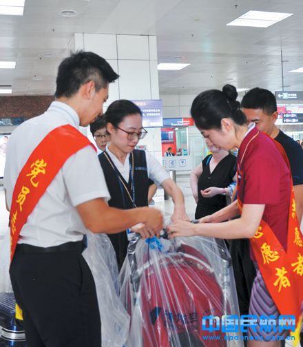 進入7月以來,身披“黨員志愿者”綬帶的南航工作人員成為珠海機場候機樓內一道流動的風景。他們為支援生產,主動放棄休息時間,到一線服務旅客。圖為南航工作人員為攜帶嬰兒車的旅客提供免費包裝袋。圖片作者:朱思平