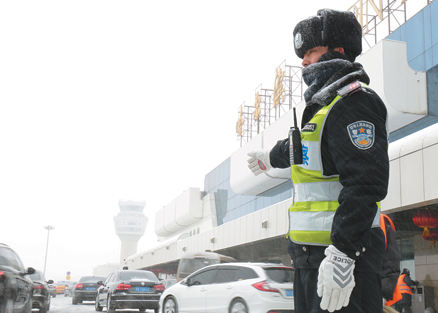 春運(yùn)期間,哈爾濱機(jī)場(chǎng)日旅客吞吐量連續(xù)超過(guò)6萬(wàn)人次,機(jī)場(chǎng)附近車流量大增,給機(jī)場(chǎng)維護(hù)交通安全造成不便。民航黑龍江機(jī)場(chǎng)公安局交通巡邏警察支隊(duì)民警頂住壓力、不畏嚴(yán)寒,加班加點(diǎn)保障進(jìn)出機(jī)場(chǎng)的車輛平穩(wěn)有序。(圖片作者:朱秀峰 黑龍江機(jī)場(chǎng))