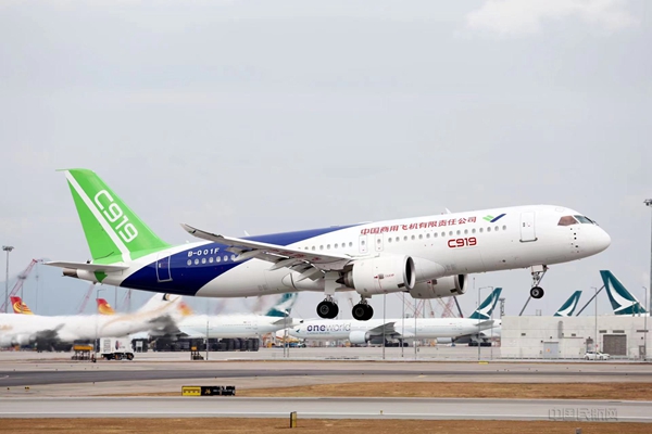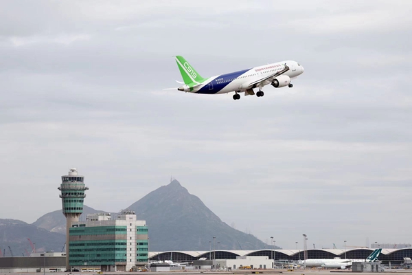 中國民航網訊:12月16日10時25分,一架藍綠涂裝的C919大型客機從香港國際機場騰空而起,飛向維多利亞港進行演示飛行,這是國產商用飛機首次翱翔香港上空。(編輯:孫文瑾 校對:王亞玲 審核:程凌)