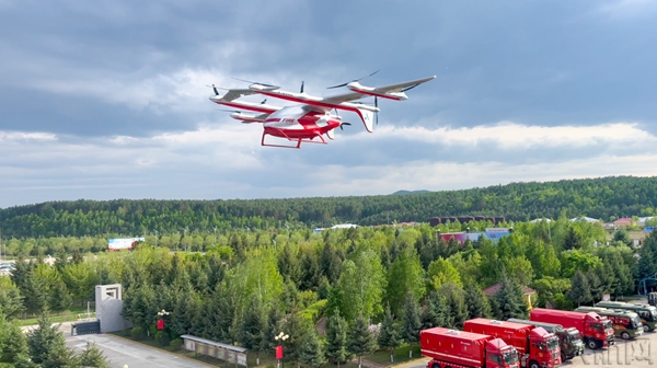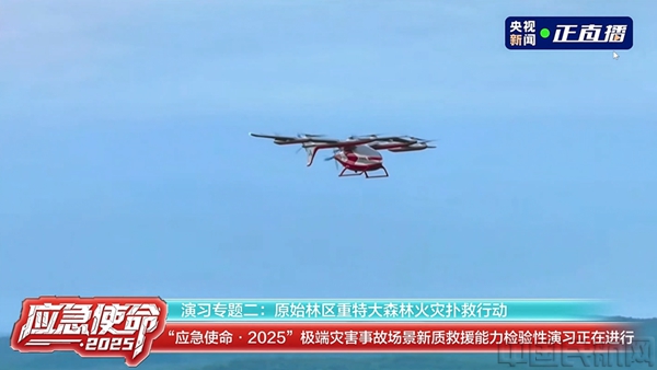 在原始林區重特大森林火災撲救行動專題演練中,凱瑞鷗消防版機型從加格達奇消防隊垂直起飛,飛越大興安嶺原始森林,僅用時8分鐘便抵達22公里外的比測區域,成功投放滅火彈和傘投應急物資,實現了大型 eVTOL 航空器在消防應急領域實際應用場景的突破性示范。凱瑞鷗消防版機型同時還在現場進行了動態演習,傘投礦泉水、餅干等物資。